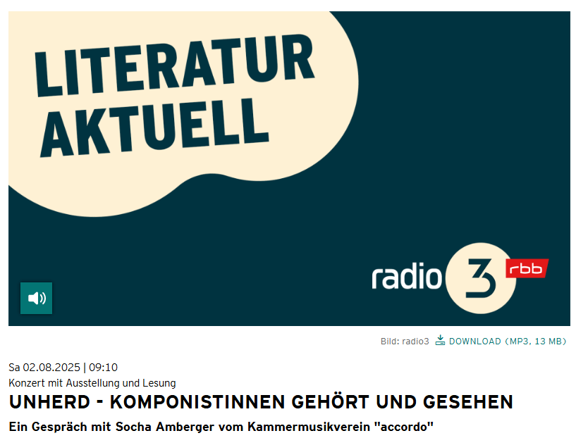 Unsere stv. Vorstandvorsitzende Socha Amberger hat ein Radiointerview zu unserem Projekt “unHERd – Komponistinnen gehört und gesehen!” im radio 3 vom rbb gegeben. Sie spricht über das Konzept unseres Projektes und gibt ein Einblick in das diesjährige Programm. Hört mal gerne rein: