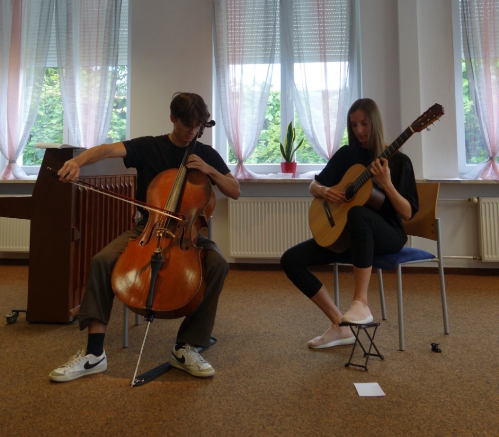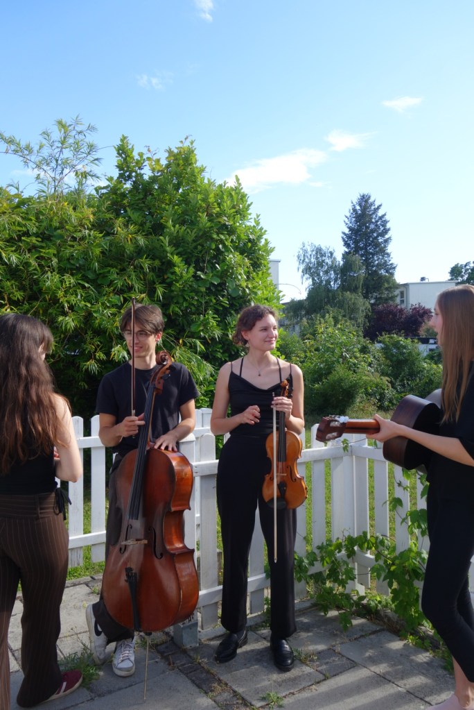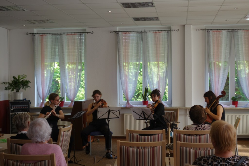 Am 16.06.2024 haben wir ein kleines Nachmittagskonzert in der Seniorenresidenz AlexA in Berlin-Lichtenrade gespielt. Das Programm bestand aus vielen verschiedenen Beiträgen, wie einem Duo von Beethoven für Geige und Cello oder auch einigen Stücken für Gitarre und Cello. Das Konzert endete mit zwei Sätzen des Flötenquartett Nr. 1 in D-Dur von Mozart.