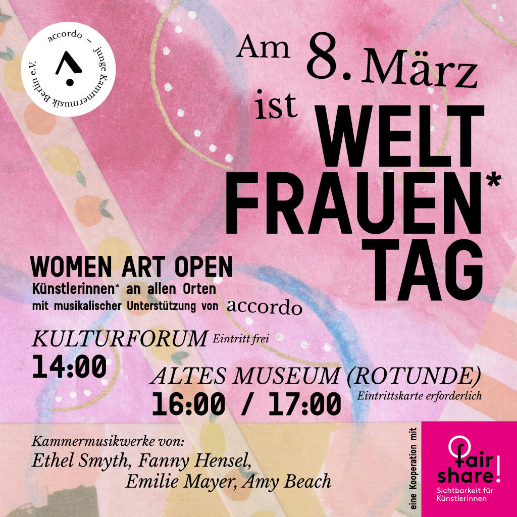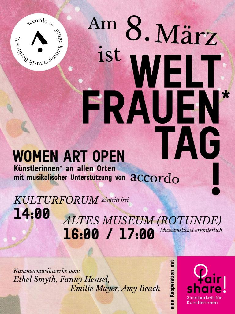 Anlässlich des internationalen Weltfrauentag werden wir die WOMEN ART OPEN Aktion von fair share! (https://www.fairshareforwomenartists.de/) mit kleinen Konzerten im Kulturforum und im Alten Museum unterstützen!